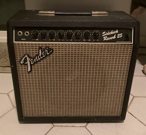 For sale is a Fender Frontman 25R guitar amplifier in good working condition with minor cosmetic wear from normal use. This is a 25-watt solid-state amp with a built-in spring reverb, 10” speaker, clean and drive channels, and EQ controls for treble, middle, and bass. It also includes an aux input, headphone out, and footswitch jack for practice or small gigs. A great, reliable amp for beginners or as a compact practice amp with classic Fender clean tones and solid reverb. Cord is included.