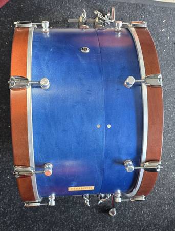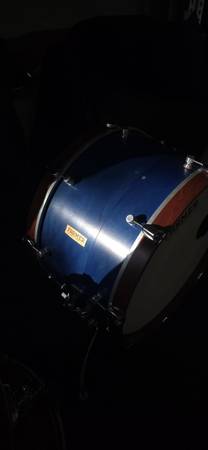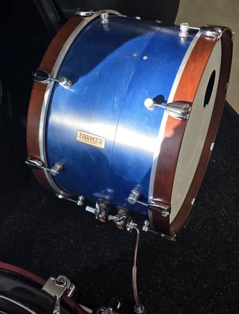 Farmer's foot drum breakaway "double stomp" model 20" kick drum in bright lake blue lacquer finish. Has magnets to help align when opening/closing, holds tight with leg clamps.