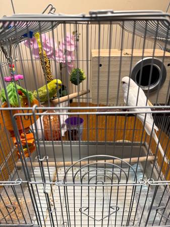 Beautiful pair of budgies, albino female and green male. They are about 1yo, recently paired, future breeders. They are not tamed. Will come with cage and nestbox. $60 for them.