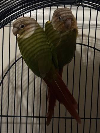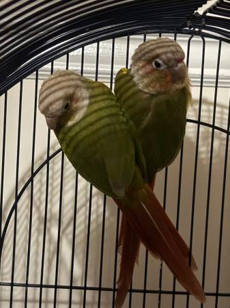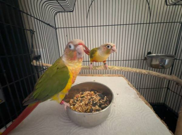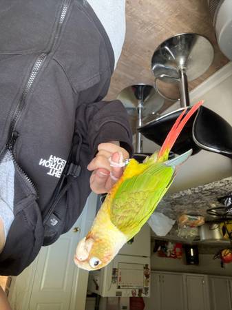 These two pineapple conures are very playful birds! One of them is fully tamed and very friendly and the other one is a bit shy but she will be very friendly and playful towards you when’s she’s used to you, she also dances! Both can be held with no problems, they love being held and petted! One is a female and she’s 1 years old and the other one’s gender is unknown but you can always blood test to see, I think the other one is most likely a male and he’s 2 years old.