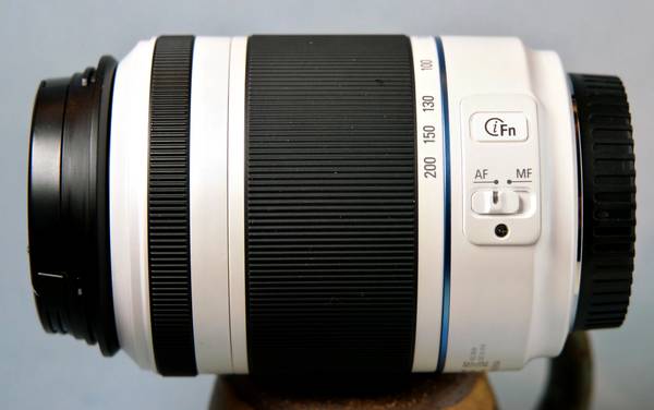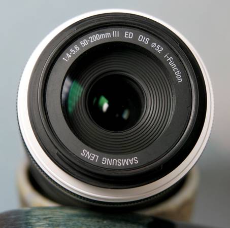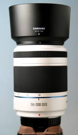Lens hood, front and rear caps included. This lens has the Samsung NX mount. The focal length zooms from 50mm to 200mm. It has moderate speed from F4 at 50mm and F5.6 at 200mm.