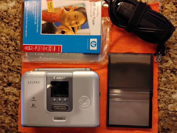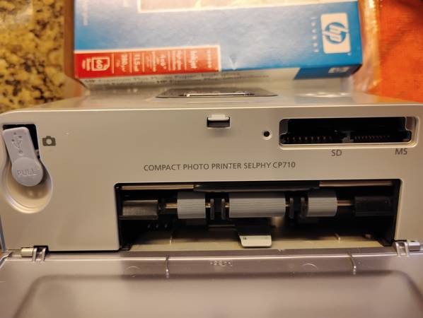 Canon compact photo printer, Selphy CP710 with everything you see pictured--plus lots of HP photo paper for printing. Csh only. If ad is up, the printer is still available.