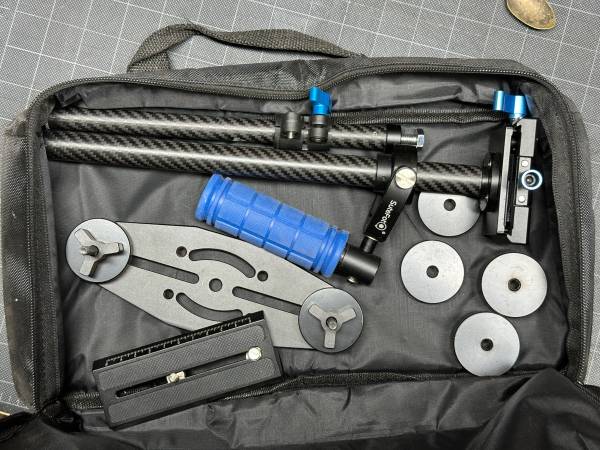 Comes with carrying bag as you can see. It feels really well made and has gotten some good reviews. Good if you won't want to pay hundreds and look foolish with a body worn gimbal stabilizer.