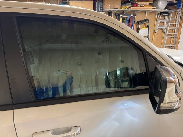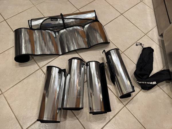 Full set of custom-fit Weathertech sun shades for all windows (rear, front windshield, and all four passenger windows) plus storage. Very high quality and laser cut to fit perfect. They pressure fit into place around each window (due to them being slightly oversized by a quarter inch or so). They have a silver side for summer and a black side for winter to absorb heat. Each shade is labeled for which window it's for. The windshield shade has been used less than 5x and the other window shades have never been used.