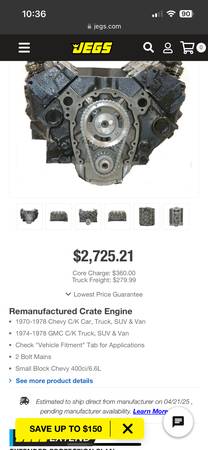 Selling a remanufacted sbc 400 crate engine. Engine is a ATK new long block that has not been fired up still in crate. 2blt 2piece rear, block casting ending #509. Cylinder heads casting ending in #991. Completely remann. The prices of these engines have gone way up and if you were to order one today you may get by January/Febuary of 2026? Have hoist to help load $2,000cash O.B.O No Shipping, No Core charge and No tax. Your gain my loss…seriously inquiries only .. Thanks for looking