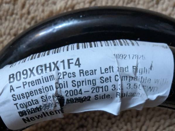 NEW - Compatible 2 Pieces Rear Left and Right Suspension Coil Springs Set with Toyota Sienna 2004-2010 3.3 and 3.5L FWD Replaces part # 48231AE031 or 81411 or 4492522 or SMS81411 ORSC20877. Retail $90. Come and get them. I only accept cash and thanks for looking.
