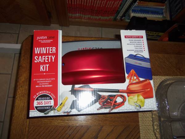 New in original box. Winter safety kit. Includes storage case, booster cables, reflective triangle, flashlight, tow strap, 3-piece aluminum shovel, flashlight, blanket, pair of work gloves, roadside...