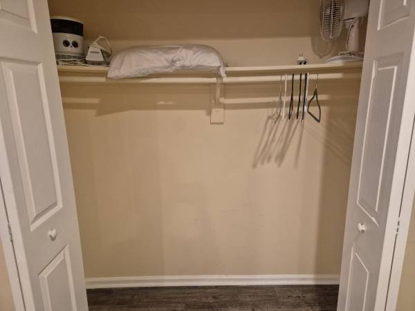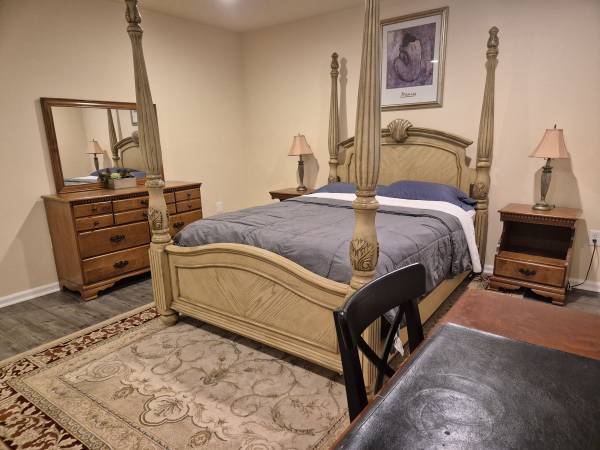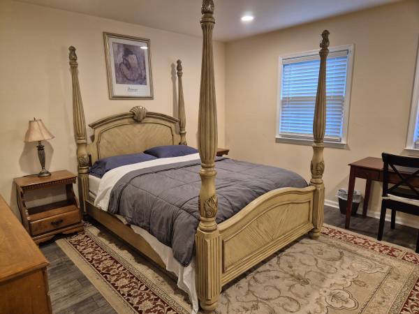 The room is quite large and fully furnished. Has a very comfortable queen bed with a top-quality mattress. Other furniture includes a dresser and a closet, desk with a chair, and two nightstands with lamps + a free standing tall lamp. Also has a personal fan and a heater.