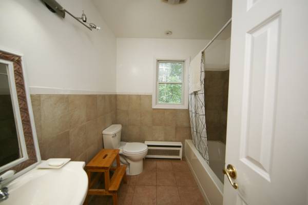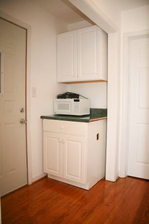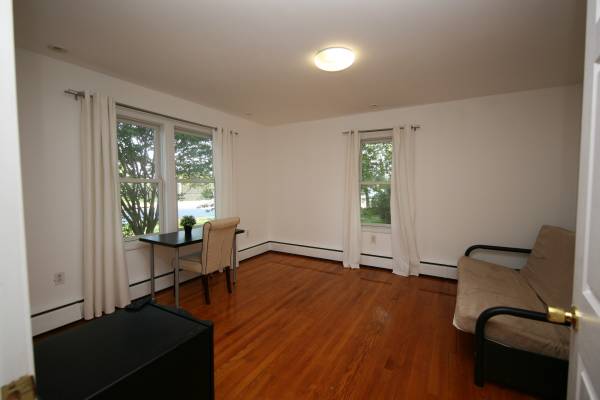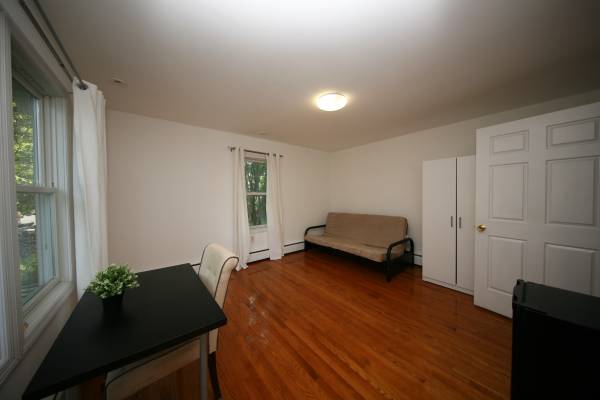 The room has clean hardwood floor. We offer a half fridge, table, futon, carpet, a free-standing armoire and if needed, some shelves.