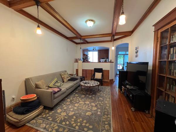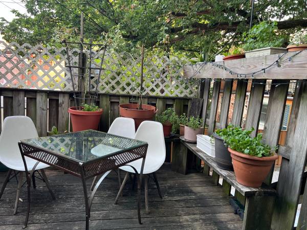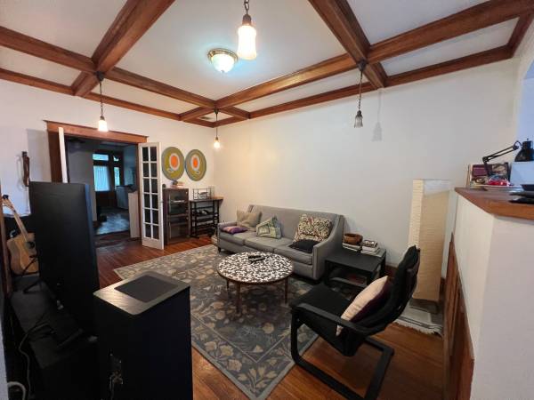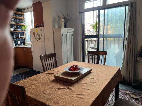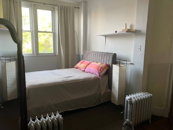 Two Story Townhouse. High ceilings, Spacious well-lit room available for single or couple in a funky but charming older townhouse. Bedroom is large with en suite shower/bath. Good water pressure. The room is about 275sf. Lots of pleasant common space with front porch and back deck.