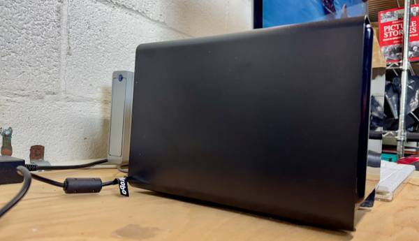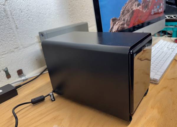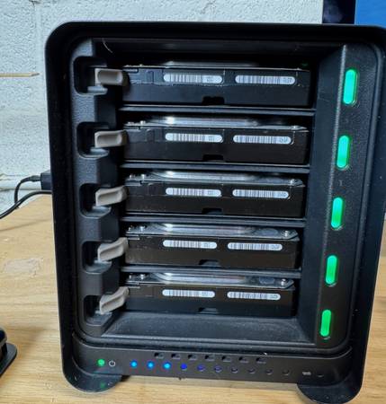This Drobo is a multi-drive safe storage system. This is a model 5C. It can use up to five bare drives, no shuttles or mount plates are necessary. The interface port is a USB-C.