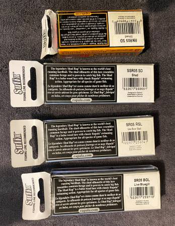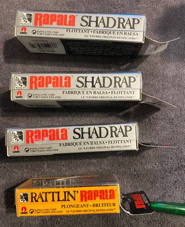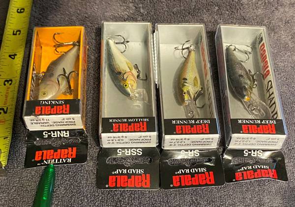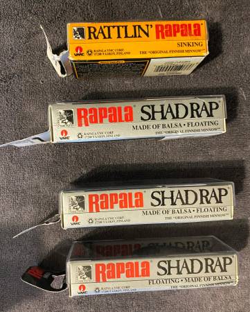Lot of 4 Rapala fishing lures new in boxes. Older lures that came with the hard cover plastic lids. The boxes are not perfect but all the lures are new. Lures include the following.