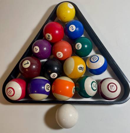 Selling a complete set of 2-1/4" billiard balls (numbers 1-15 plus cue ball) and triangular rack by Brunswick.