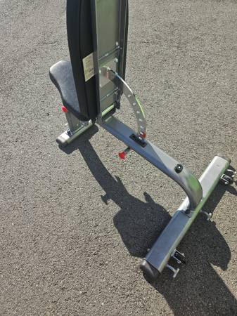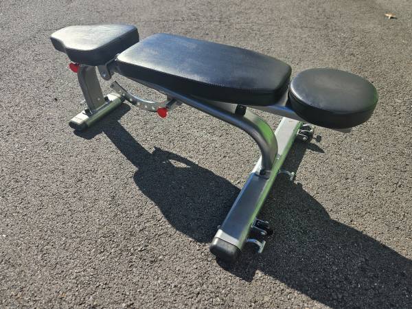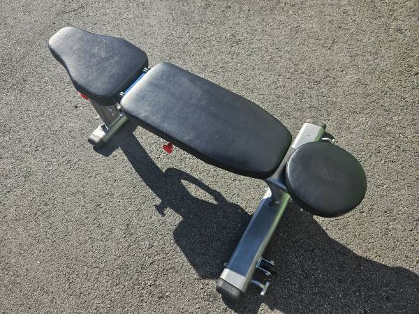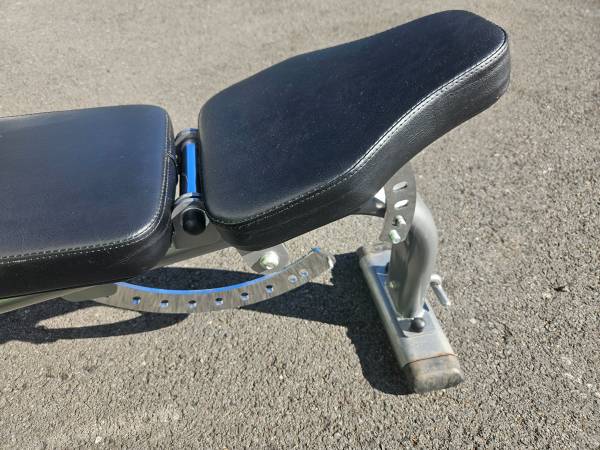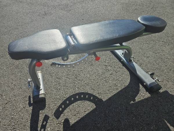 Adjustable with flat, incline, and decline settings. Seat and back pad adjust easily with pop pins. Bench has wheels and a handle to move around easily. Small areas with paint chips / rust at bottom edges but great condition, used in home gym.