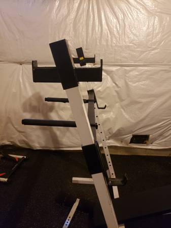 Bench with built in rack. Includes dip bars and lat pull down machine attachments $125. Weight plates / bars not included, available separately. weight bench press standard size olympic work out...