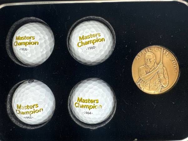 Includes 4 golf balls recognizing Palmer's 4 Masters championships in 1958, 1960, 1962 and 1964; a coin/medal dated April 8-11, 2004, marking Palmer's 50th appearance; and commemorative tin.
