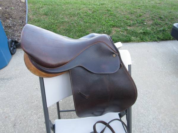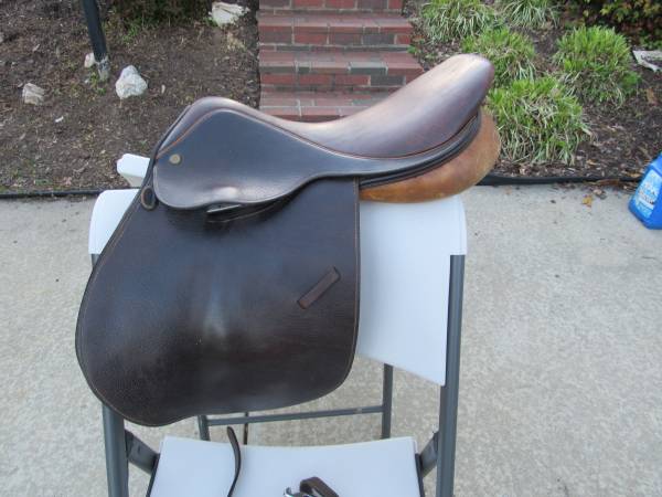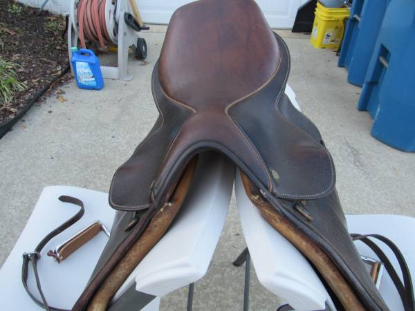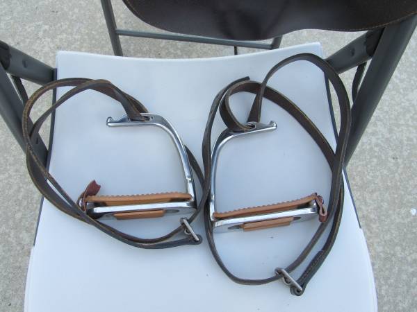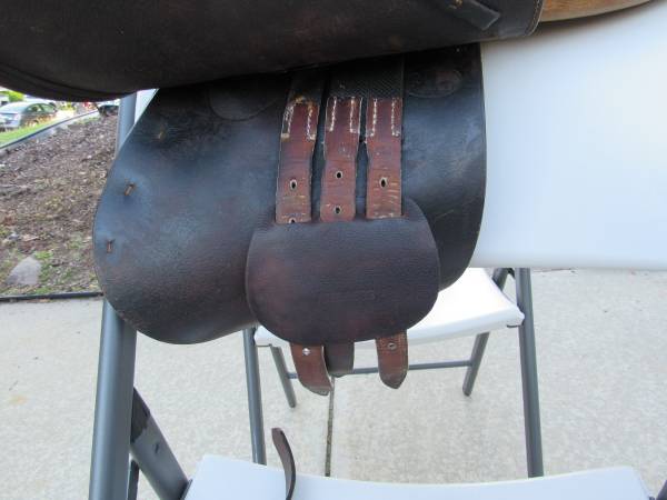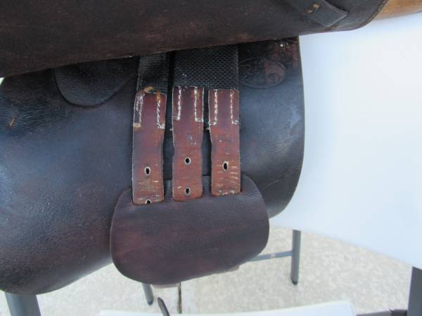 The saddle is in good condition with some minor usage wear. Stirrups are included, and there is no brand name on them. No rips, tears, or holes. See photo's