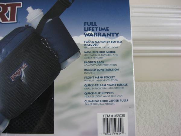 The Hydration Waistpack is a dark blue color, and the mesh pocket is black from what I can view through the box window. The box has a few small tears in the shrink wrap along with some minor storage...