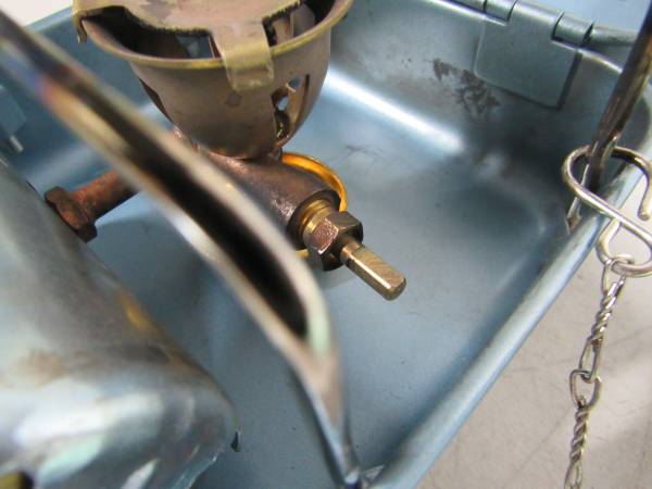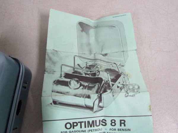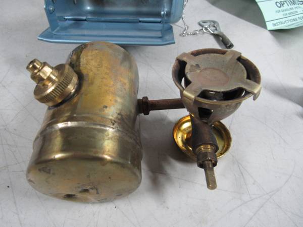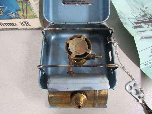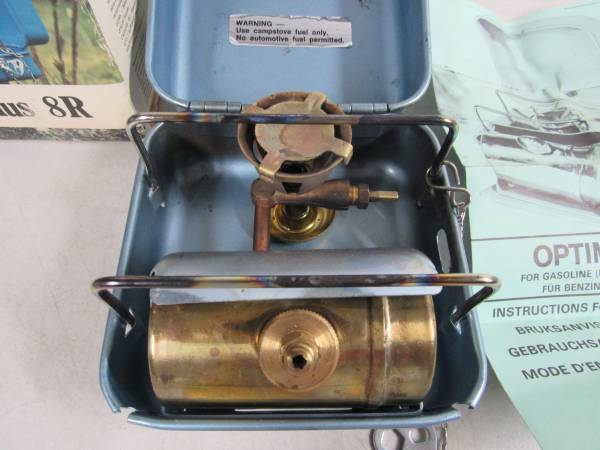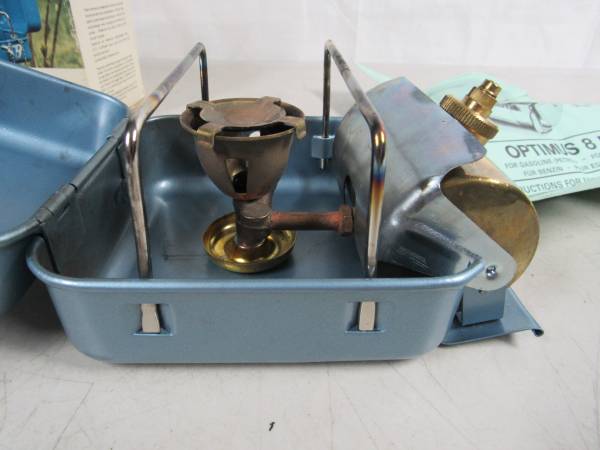 The camp stove is 5 1/4" x 5 1/8" X 3 1/8", and weighs 1 pound 7 ounces empty without fuel. Made of steel, good working and cosmetic condition. Comes in original box with instructions. No fuel...