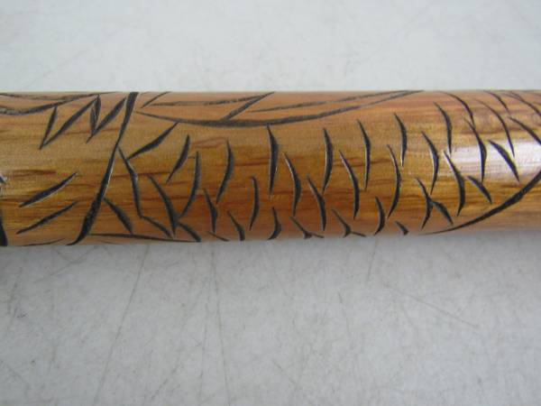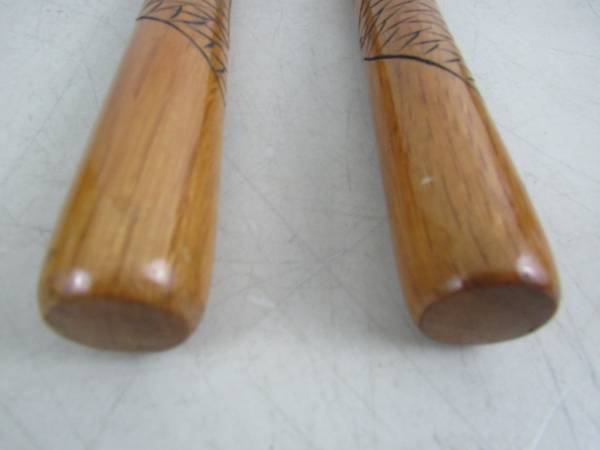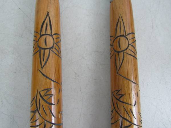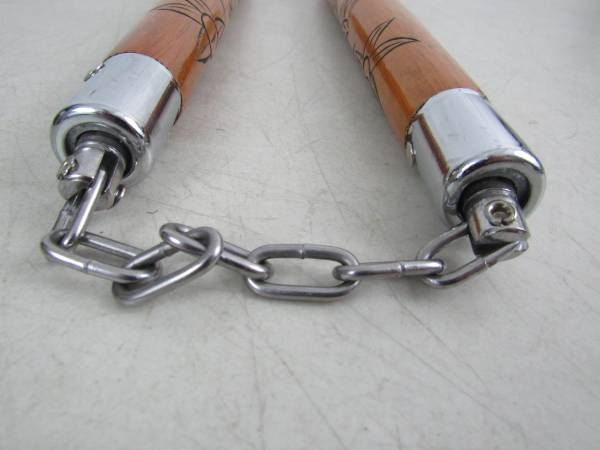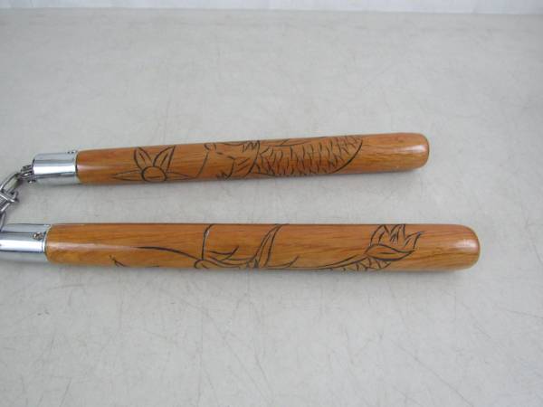 The Nunchucks are 12" length for each X 5 1/2" spacing between X 1 1/8" diameter. Made of hand etched wood, and steel chain and attachments. Good condition with some minor usage wear. See photo's