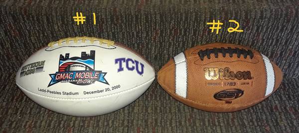 --Ball #1 is a Collector Series SPF-507 regulation size ball (11 inches long) from the 2000 GMAC Mobile Alabama Bowl (Southern Miss vs. TCU), has noticeable wear around the seams (please see closeup photos)