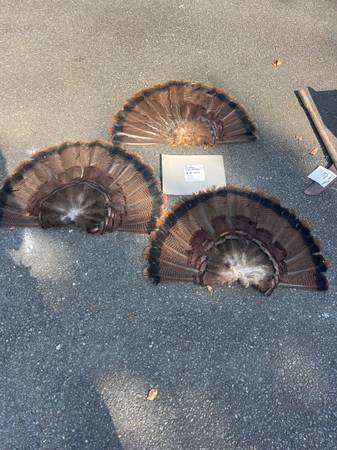 TURKEY FEATHERS FANNED OUT…..HARVESTED IN LOUDOUN COUNTY….. MAKES A GREAT CONVERSATION PIECE TO HANG ON YOUR WALL……DONT HAVE TIME TO HARVEST YOUR OWN ….. NO PROBLEM……YOU CAN PURCHASE A NICE WOODEN PLAQUE TO ATTACH FEATHERS TO…… CASH ONLY ……MUST PICK UP