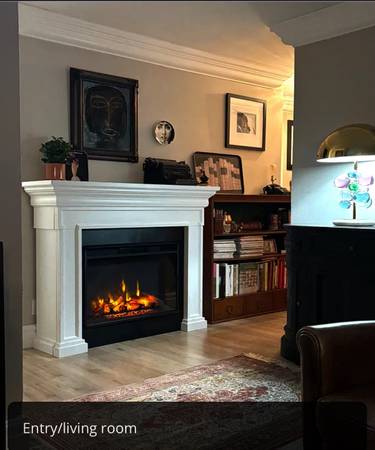Furnished with an eclectic mix of antiques and modern furniture, including an electric fireplace, deep sofa, and zero gravity recliner. 1 queen bed and one full bed.