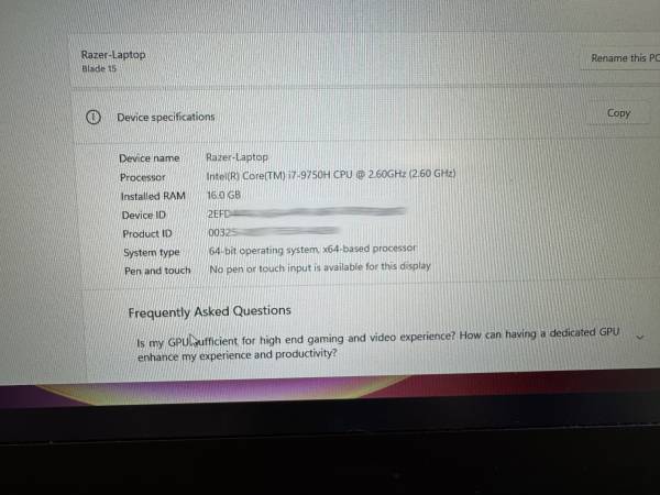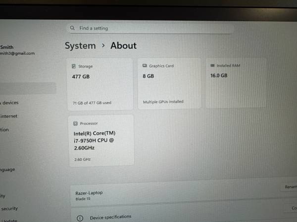 PRICE IS FIRM. Cash only. Must pick up. 2019 Razer Blade 15 - Advanced, 9th Gen Intel Core i7-9750H 2.6 GHz -6 Core -16gb 2667 MHz DDR4 RAM -512 gb HDD -15.6" 1920x1080 res 240 hz display -NVIDIA...