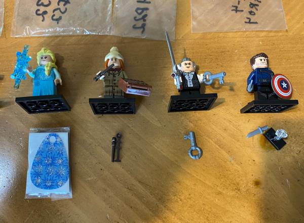 The cape for the DIS032 figure is pressed against cardboard to prevent any damage. The COLHP22, COLHP32 and COLHP28 come with extra wands that were part of the original set. The COLHP22 figure has both of the hairpieces that were also part of the original set. The COLMAR04 figure has a spare knife that came with the original set. Specifics on each set are shown in the last image.