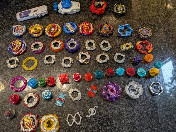Set of beyblades, launchers, storage boxes and 3 stadiums.