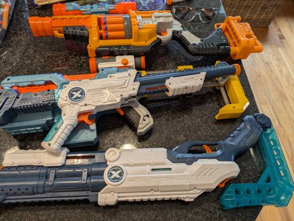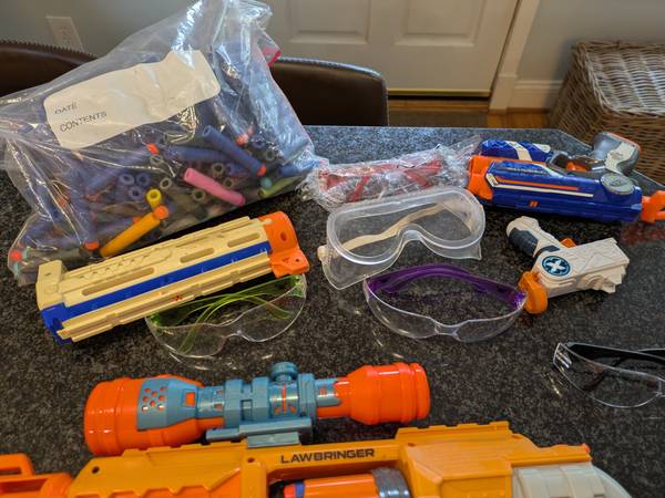 Multiple nerf guns, ammunition, vest and goggles. Be prepared for the next nerf gun war!