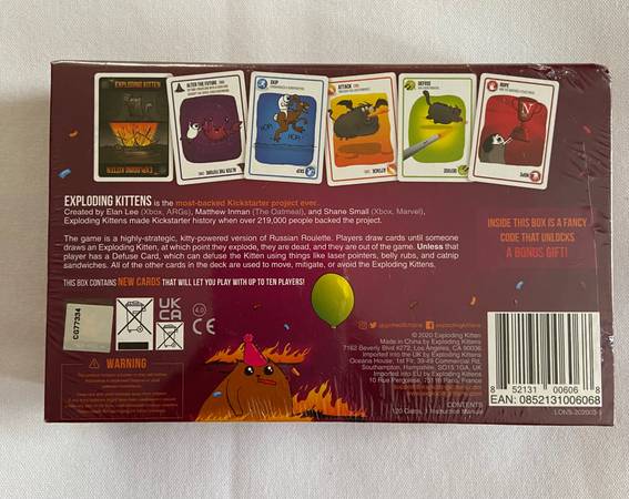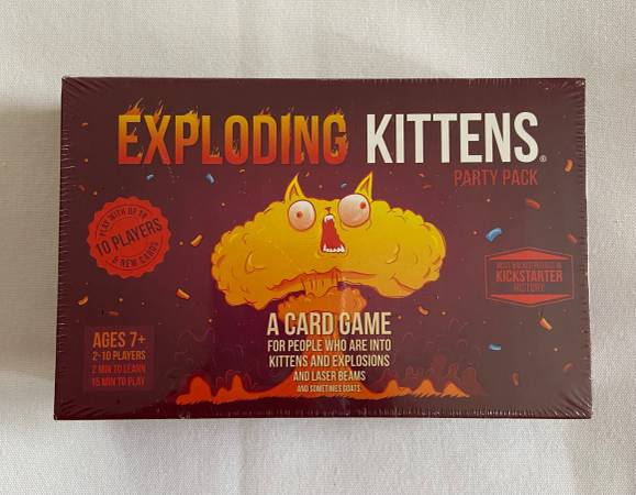 “The Party Pack is the same family-friendly party game as Exploding Kittens but now for up to 10 players! Double the players, double the strategery!”