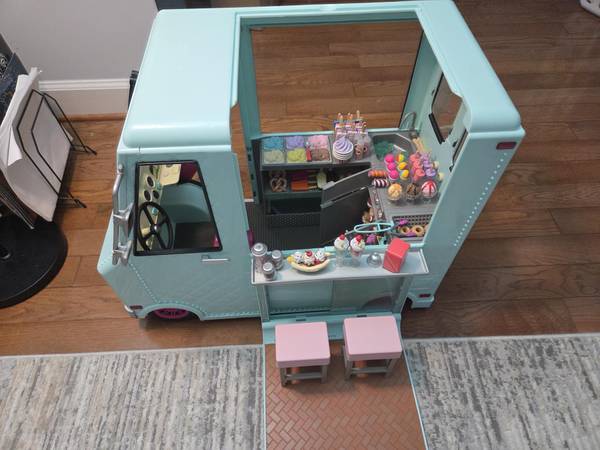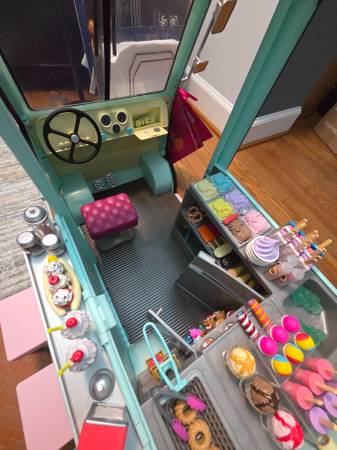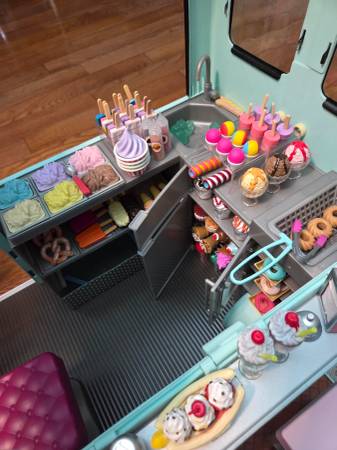 Includes: ice cream truck, 2 stools, and a huge variety of realistic play food, cones, milkshakes, ice pops, and other treats.