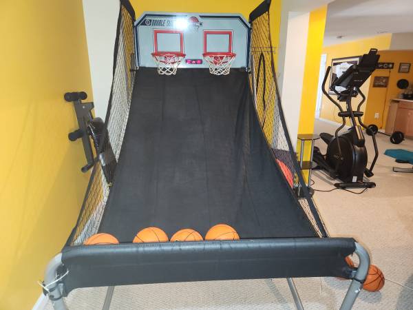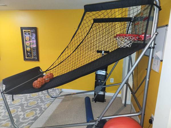 Home arcade basketball system. Folds for convenient storage. Amazon has current version for $289. Has been loads of fun for our kids and neighborhood. Slight tear in netting next to base but very...