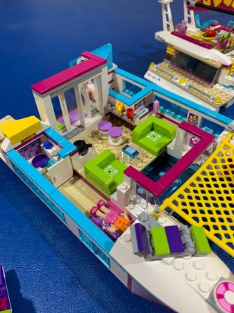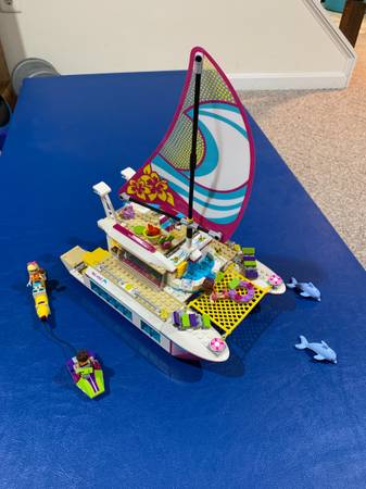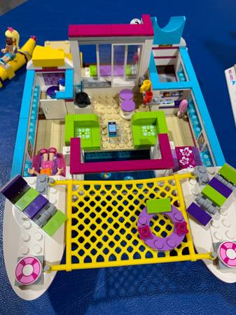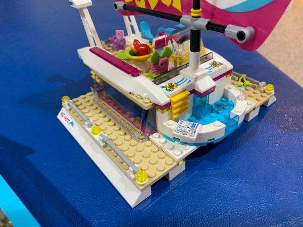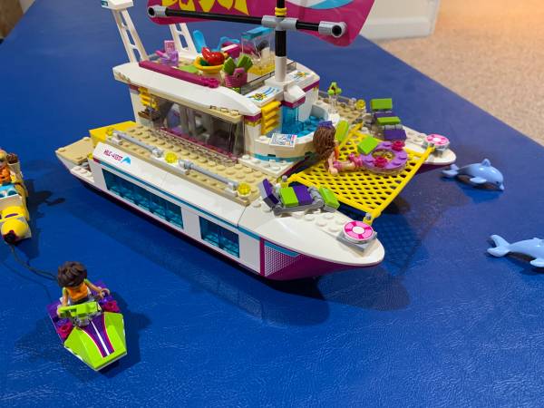 Take a luxury cruise on the LEGO® Friends Sunshine Catamaran, with a sun deck, pool, bridge, slide, spiral stairs, garage and sliding doors into the living quarters. Lift the top off the boat for easy access to the kitchen, bedrooms and lounge with a clear bottom. Use the personal water scooter to pull the banana boat or inflatable ring and play with the friendly dolphin all day long. Includes 3 mini-doll figures and 2 dolphin figures.