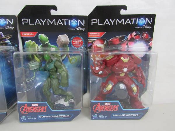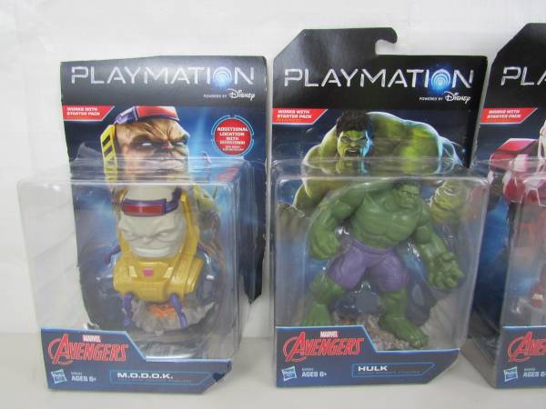 The set includes Hulk, Hulk Buster, M.O.D.O.K., Iron Man, Marverl's Hawkeye, and Super Adatoid. Manufactured in 2015 by Hasbro. The action figures have never been removed from the factory sealed packages. There is some minor storage wear to the packages.