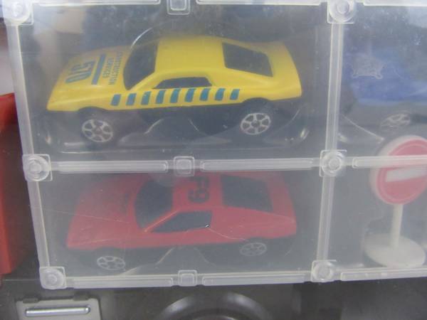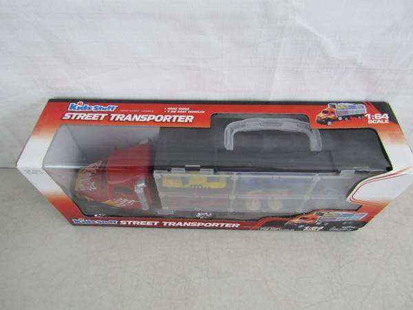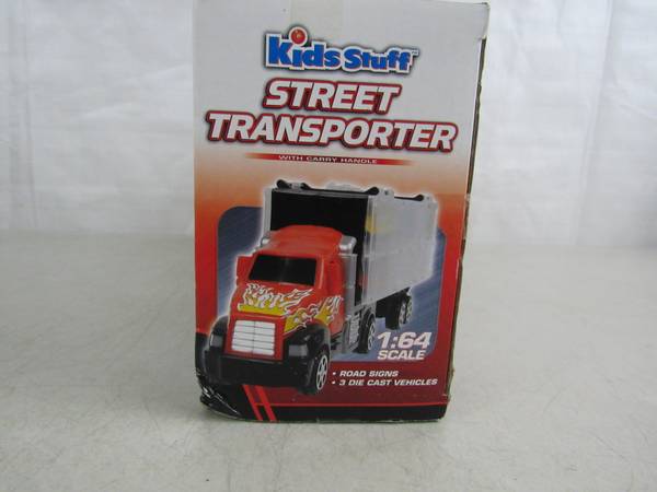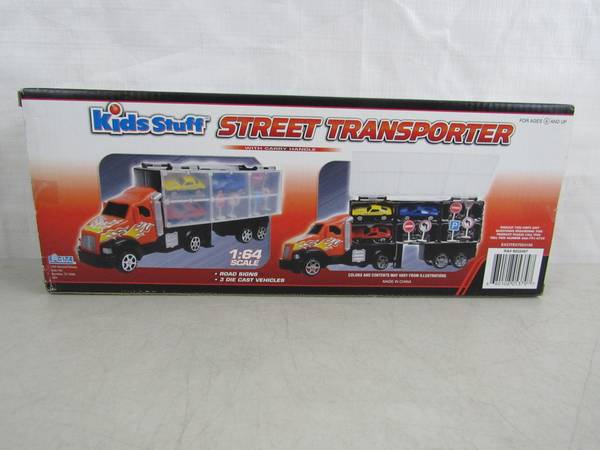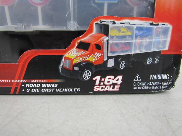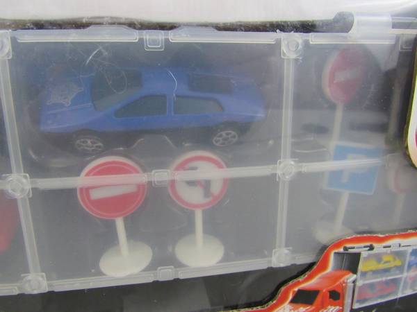 The transporter set includes Semi & Carrier with carry handle, 3 Die Cast vehicles, and 6 road signs. The semi with carrier is 13 1/2" length.The box has never been opened, and the contents never removed.