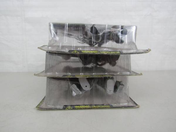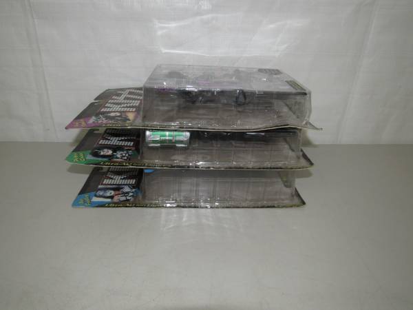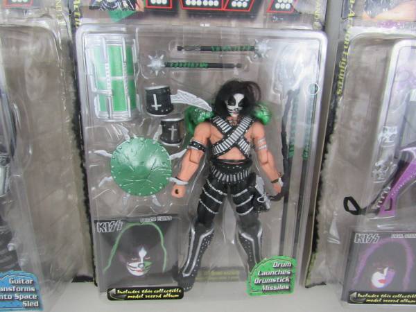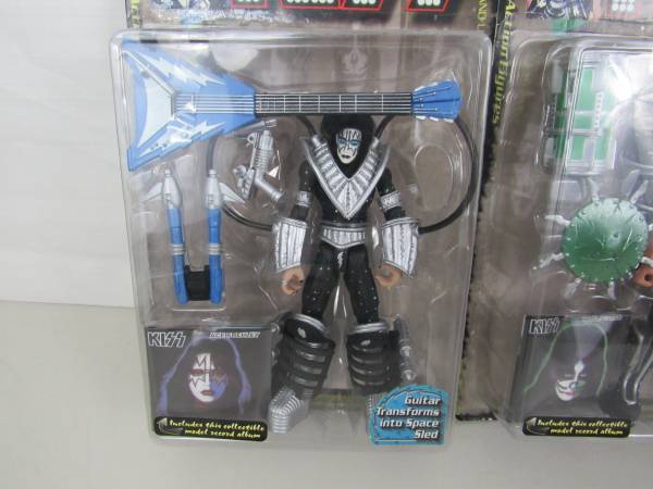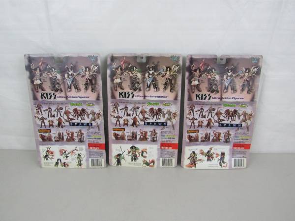 The Kiss action figures are 8" tall approximately, and are factory sealed in their original packages.The set includes Ace Frehley, Paul Stanley, and Peter Criss. Accessories included in each package. Manufactured by McFarlane Toys in 1997. The packages have some storage wear, crease bends, and dents in the plastic bubble and cardboard backing. No rips, tears, or holes.