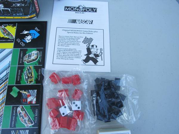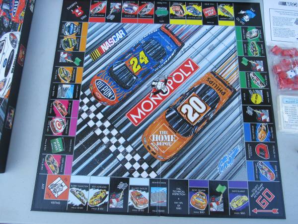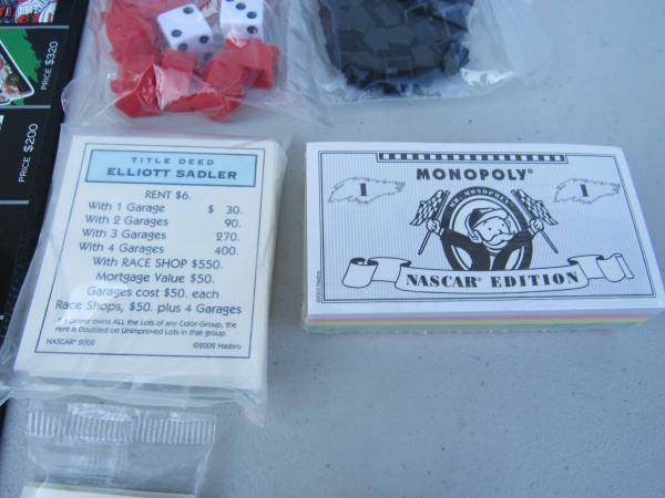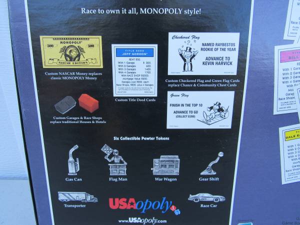 The ultimate battle for pole position in NASCAR® racing……and you’re in the driver’s seat! Advance to GO and play the NASCAR edition of the world’s most famous board game. The Monopoly BRAND proudly introduces a game designed exclusively for NASCAR race fans and collectors. The game was opened but all the game parts are sealed except for the six pewter tokens. The box has minor storage wear and a bump mark in one corner.