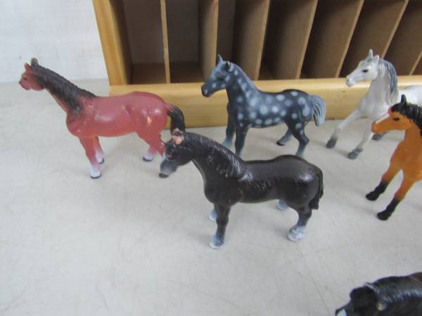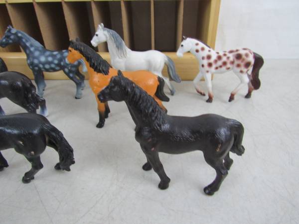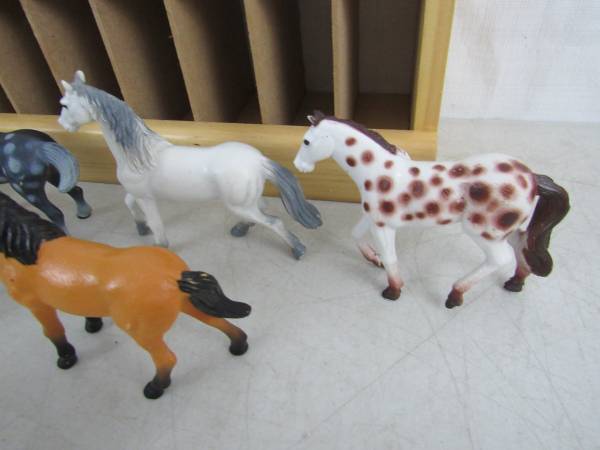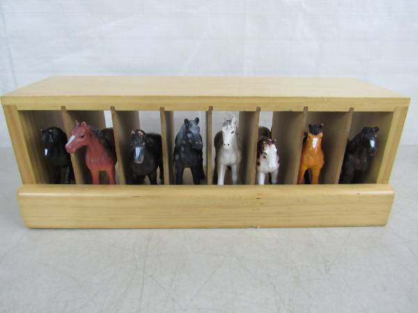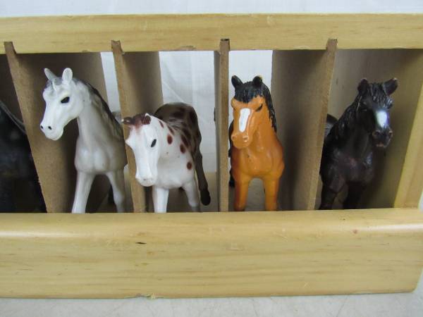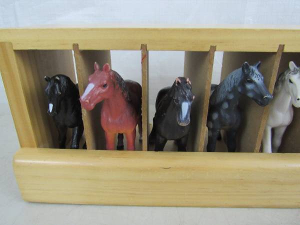 The horses are 3 1/2" height X 4 1/4" length approximately. The horses are made of a durable resin type of materiel. The stalls is made of wood and is 12 15/16" length X 4 5/8" height X 4 3/8" depth, and manufactured in 2007. Good condition with some minor usage wear. No broken are missing parts. The breeds of horses are Toric, Friesian, Shire, Percheron, Andalusian, Knabstrup, Brumby, and Polish Draft.