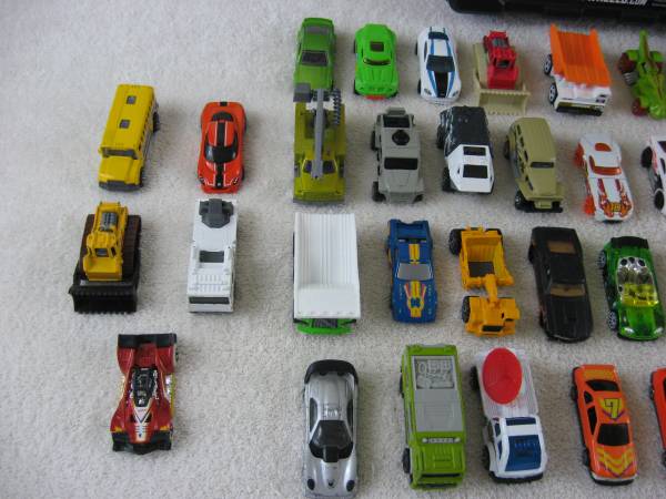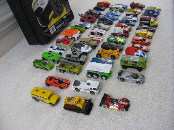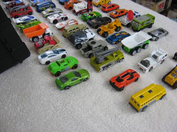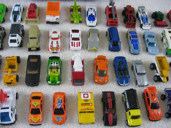 This set of Die Cast vehicles are 1:64 scale. Made of die cast metal with plastic parts. Good condition overall with typical play usage scratches, scuffs, paint chips or wear, and a few have bent axles and broken off parts. The vehicles were manufactured in the 1990's-2000's. There is Hot Wheels, Matchbox, Mattel, and some misc. no brand name vehicles.