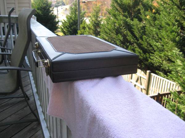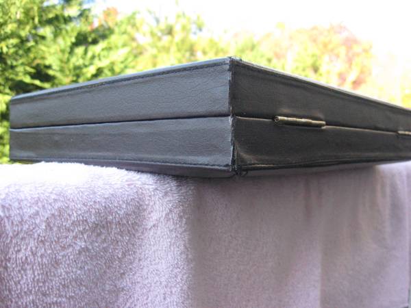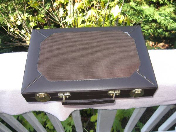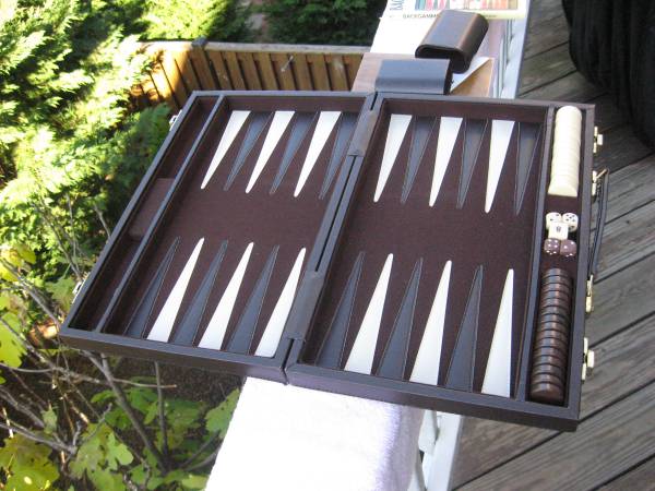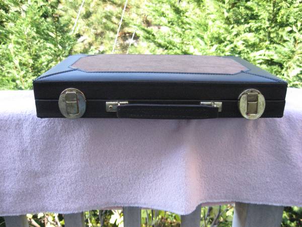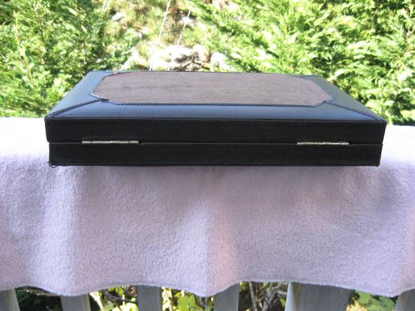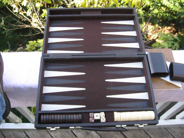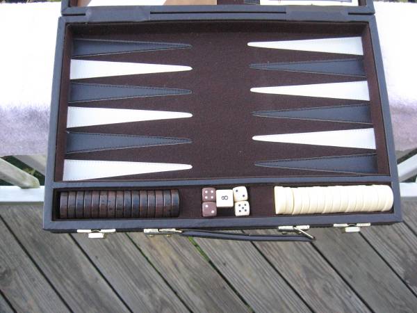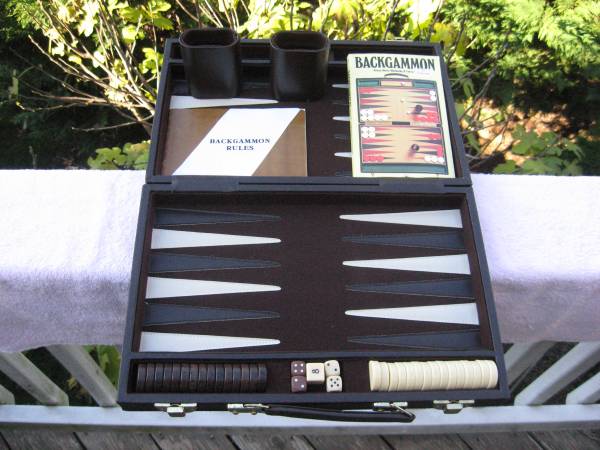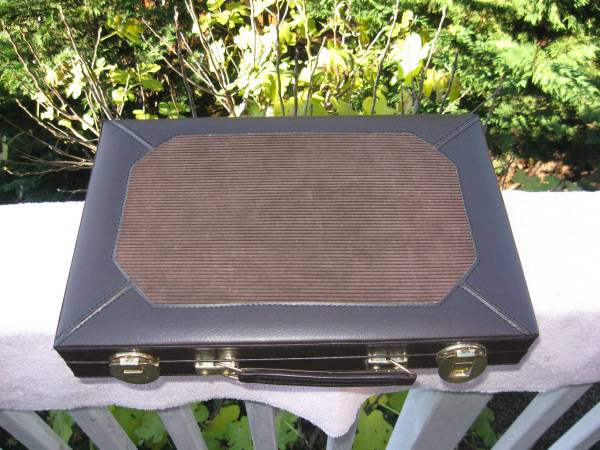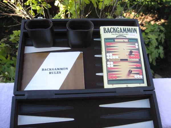 This vintage Backgammon game is complete and comes with an extra game book written by Prince Obolensky & Ted James. The carry case is 15 1/8" X 10" x 2 1/4" when closed and 19 3/4" X 10" when opened for game play. The case is lined with faux leather and corduroy material on the outside and faux leather and felt material on the inside. The playing pieces are 1 1/8" and are made of a hard bakelite type plastic. The game parts are in very good condition and the carrying case has age discoloration and some age discoloration on the latches. The bottom side of the carrying case the faux leather is peeling back on the inside edges where the leather meets the corduroy material. The inside is very clean.
