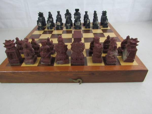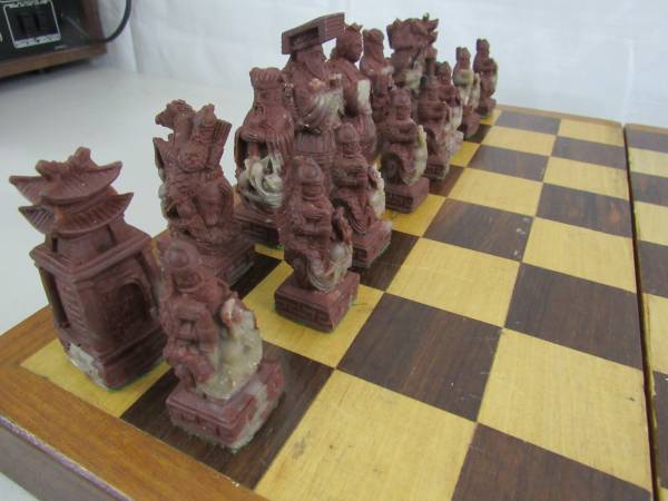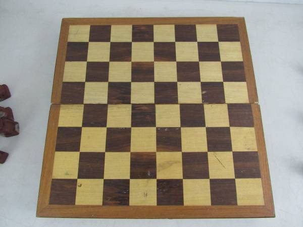 The chess board is 14 3/4" X 14 3/4" X 1 9/16" approximately. The King and Queen is 3", and the pawns are 2 1/2" approximately. Good condition with some normal age and usage wear. There is one pawn that has a chip in the side at the base.