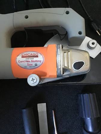 Chicago 93009 concrete slotting saw in excellent condition. No blade, but I believe it has all the parts and works when plugged in. Photos depict condition and parts; comes with a carry case. These sell for over $200 used. Asking $50.00 CASH ONLY.....OBO.