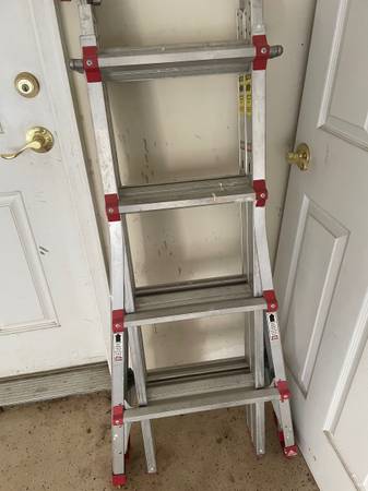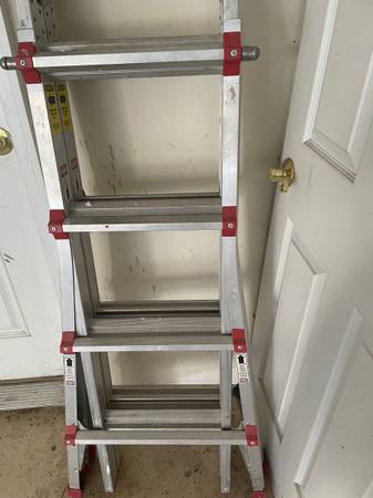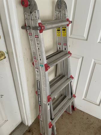 This multiposition folding ladder is an all-in-one ladder system with 23 possible configurations. The multitask folding ladder is constructed of superstrong aircraft-grade aluminum and supports up to 300 lb. When not in use, the step ladder folds flat for easy transport or storage. Basic setups include 1) A-frame ladder, 2) extension ladder, 3) 90° ladder, 4) staircase ladder, and 5) scaffolding.