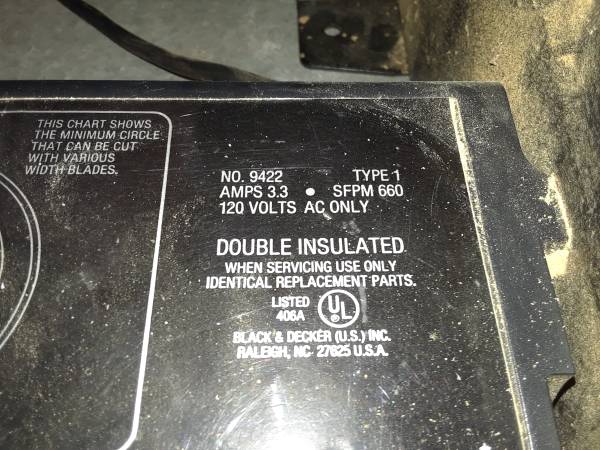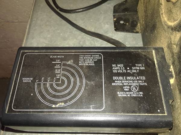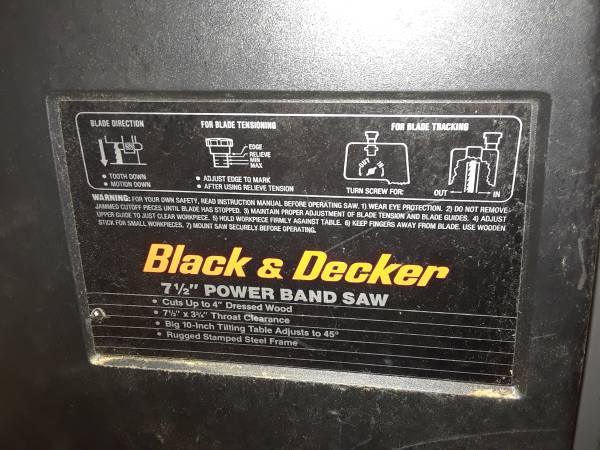 Black and Decker 7.5-inch band saw, model number 9422, powers up but needs new bands, $25. Pickup in Potowmack Crossing condo complex, 1636 West Abingdon Drive, Alexandria VA 22314.