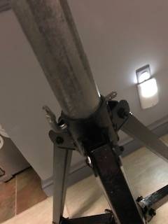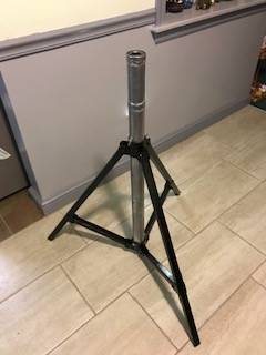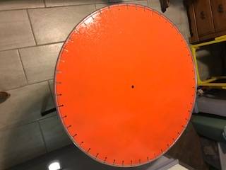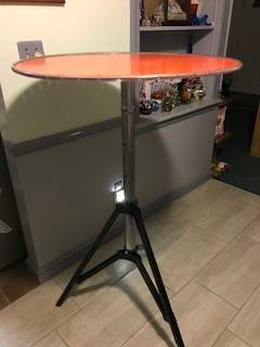 Metal table, round top is 30 inches in diameter and spins, top can be separated from stand, the height can be adjusted 37.5 inches, 42 inches or 49.5 inches.