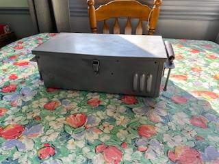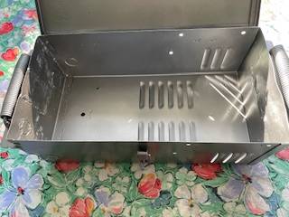 all metal box, measures 17 x 9 x 6 inches, has handles on the side that slide up and down.