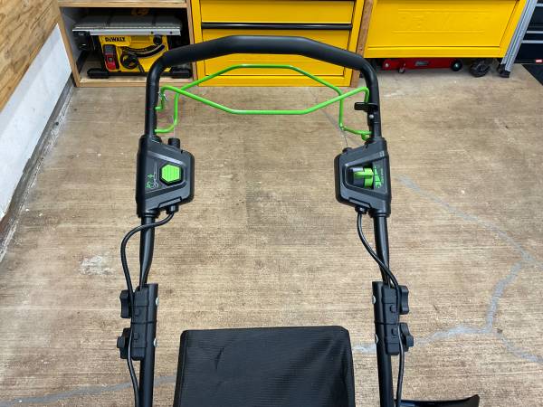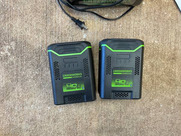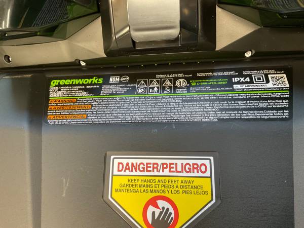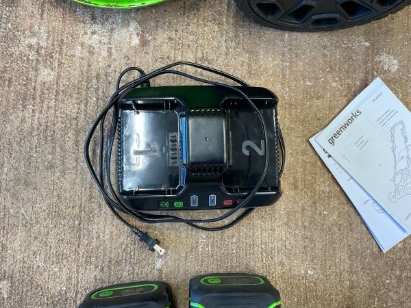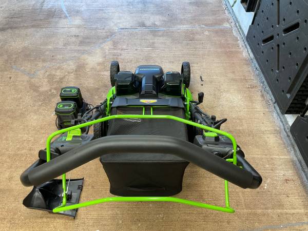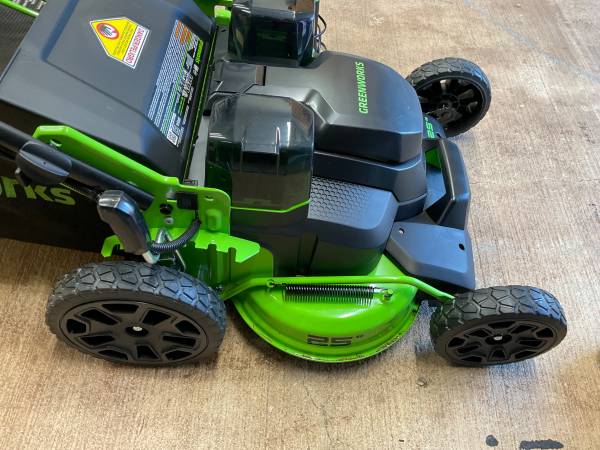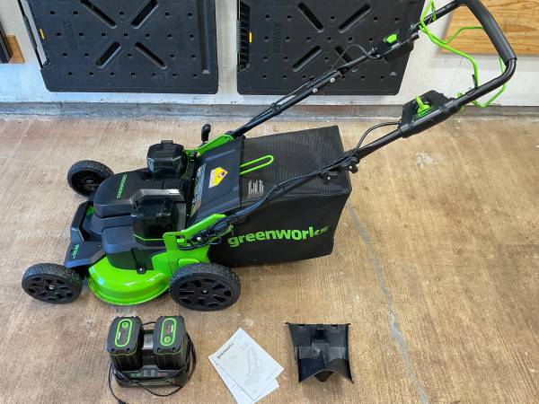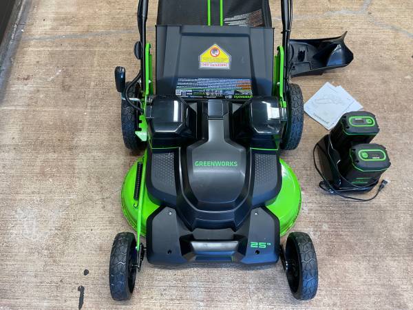 Greenworks 25 inch 82 volt self propelled lawnmower. Includes two batteries and double charger. 3 months old excellent condition.