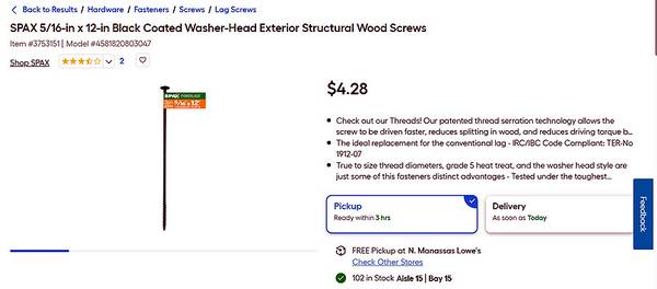 Half inch x 12" lag screws (bolts if you will): Large washer-heads Use to hang tools & ladders, secure retaining walls or build a tree stand. At this bargain price, you'll figure out something....